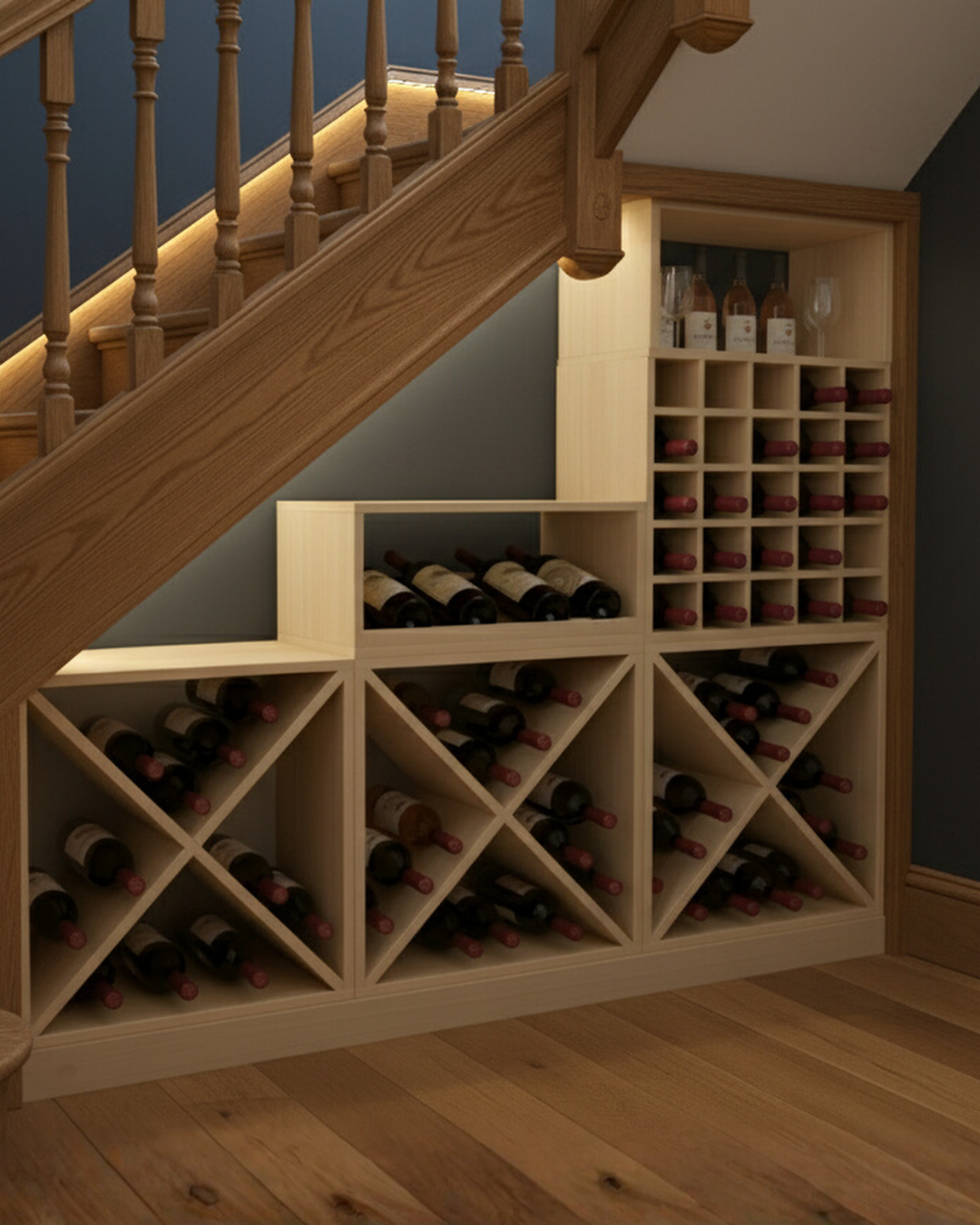 Maximise your space in style with the Under Stair Wine Rack Display 01 – a custom-designed wine storage solution that fits neatly under staircases or against walls. Crafted to combine functionality with design, this package gives you versatile storage options for wine collectors and entertainers alike.